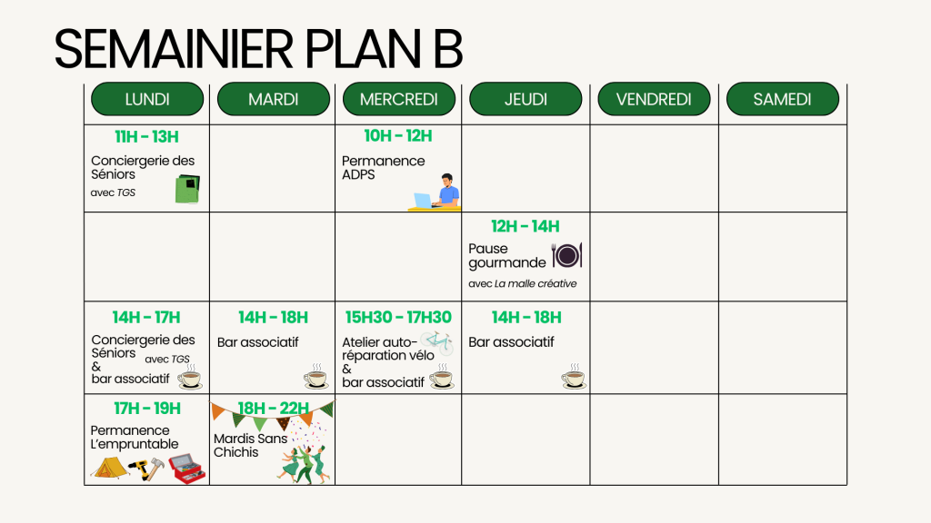 Plan B est un collectif d’habitants qui souhaite répondre aux besoins essentiels des associations et des habitants du territoire que sont l’alimentaire, le réemploi, la pratique du numérique, le faire soi-même grâce à des activités inspirées des principes de l’économie circulaire et du lien social, en développant le pouvoir d’agir des habitants sur le quartier populaire de Bellevue à Nantes.